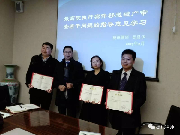 同时,会议进行了该“公司治理法律风险控制服务中心”开年后的第一课培训,对2017年1月20日发布的《最高人民法院关于执行案件移送破产审查若干问题的指导意见》(下简称“《执转破指导意见》”)进行了学习。主讲人吴昌华律师围绕该意见出台的背景、目的以及重大意义、执行转破产案件的条件、执行转破产案件的管辖、执行和破产程序的层序的衔接、工作流程、注意问题等几个方面进行了详细的讲解。