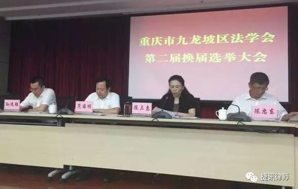 重庆九龙坡区法学会第二届会员大会于2017年8月24日上午在区会议中心举行。会议听取了区委常委、区政法委书记、区法学会会长陈三慧所作的工作报告,会议选举产生了第二届法学会领导机构成员。区委常委、区政法委书记陈三慧高票当选第二届法学会会长,区人大副主任张邦庆、副区长区公安局长廖勇、区政协副主席范国明、区法院院长范晓明、区检察院检察长赵凡、重庆捷讯律师事务所主任孙远强律师再次当选为法学会副会长,另有8位同志当选为法学会理事。来自公、检、法、司等部门的会员约100多人参加了会议。