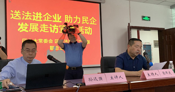 市场经济就是法制经济,为了给民营企业营造更好的营商环境和法制环境,2019年4月24日和25日下午,九龙坡区人大常委会、九龙坡区司法局、九龙坡区工商联联合举办了“送法进企业、助力民企发展”走访宣讲活动,立足为我区民营企业和企业家提供送法上门的服务和解困答疑的帮助。此次活动分东部和西部两场举行,区人大常委会副主任张邦庆亲自主持该宣讲活动,区司法局副局长青虎、区工商联副主席彭春生等领导参加了该活动,重庆捷讯律师事务所主任孙远强律师应邀请作为此次活动的主讲嘉宾,为中小企业家们开展了“劳动用工风险防范及措施”专题讲座。西部专题讲座在走马镇九高物流股份有限公司举行,共有大约100名企业家参加了讲座,东部专题讲座在二郎重庆精准生物技术有限公司举行,共有120多位企业家参加了此次培训。