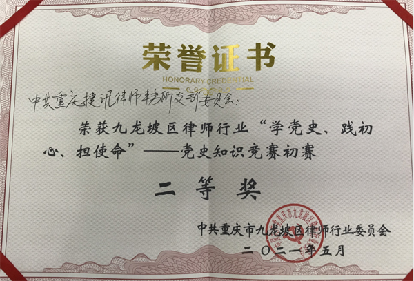 2021年5月10日下午,在九龙坡区律师行业“学党史 践初心 担使命”—学党史知识竞赛中,重庆捷讯律师事务所荣获二等奖,可喜可贺。