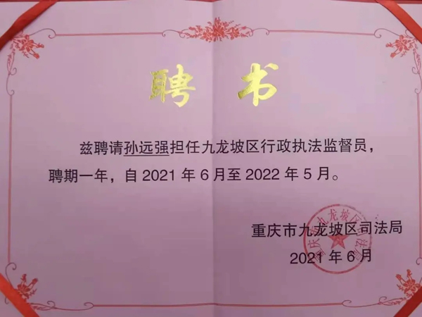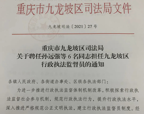 捷讯所孙远强律师受聘担任九龙坡区行政执法监督员