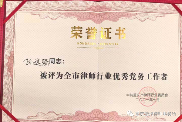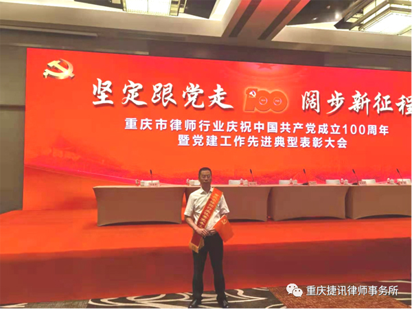 2021年7月16日下午,在重庆市律师协会召开的党建工作先进典型表彰大会上,重庆捷讯律师事务所党支部书记孙远强荣获“优秀党务工作者”光荣称号。
