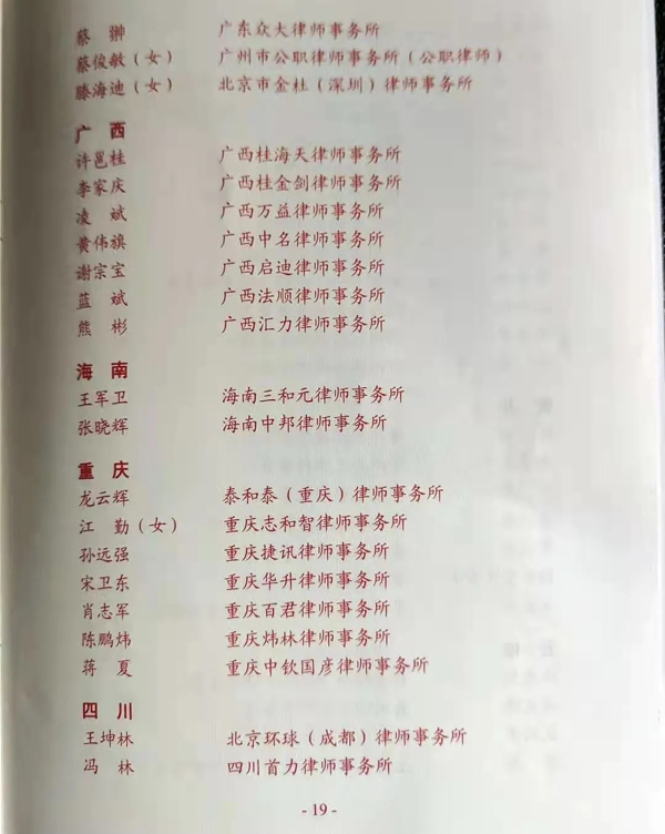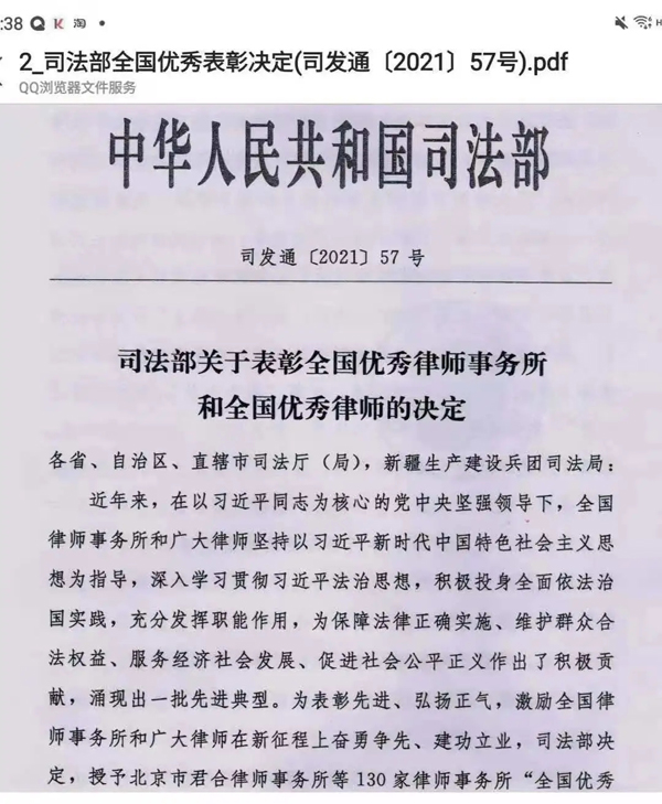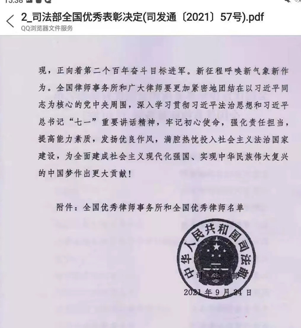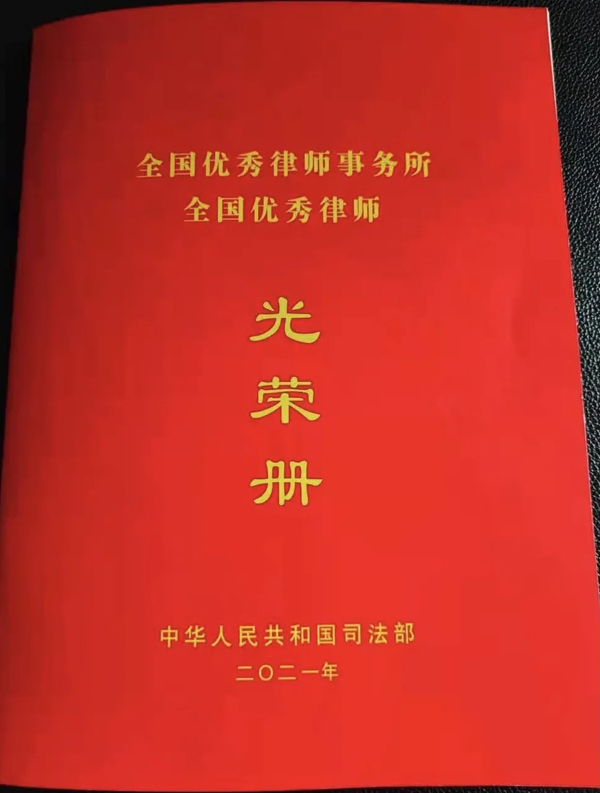 2021年10月13日,在北京人民大会堂,为表彰先进、弘扬正气,激励全国律师事务所和广大律师在新征程上奋勇争先、建功立业,司法部发布《关于表彰全国优秀律师事务所和全国优秀律师的决定》,对全国律师行业的优秀代表进行表彰,授予全国130家律师事务所“全国优秀律师事务所”称号,授予289名律师“全国优秀律师”称号。