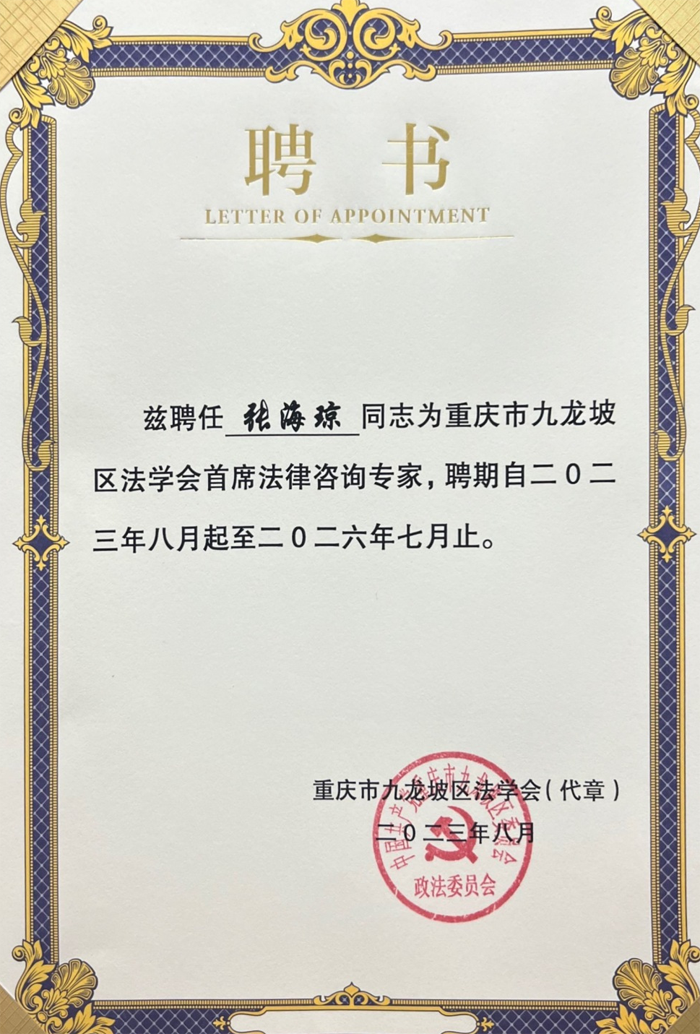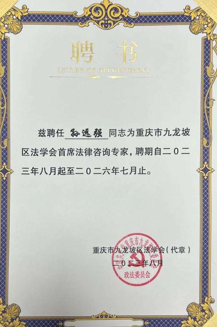 近日,重庆市九龙坡区法学会公布《关于聘请罗顺卿等35名人员为首席法律咨询专家的通知》,我所创始人孙远强、律所主任张海琼入选民事法律类首席法律咨询专家名单。