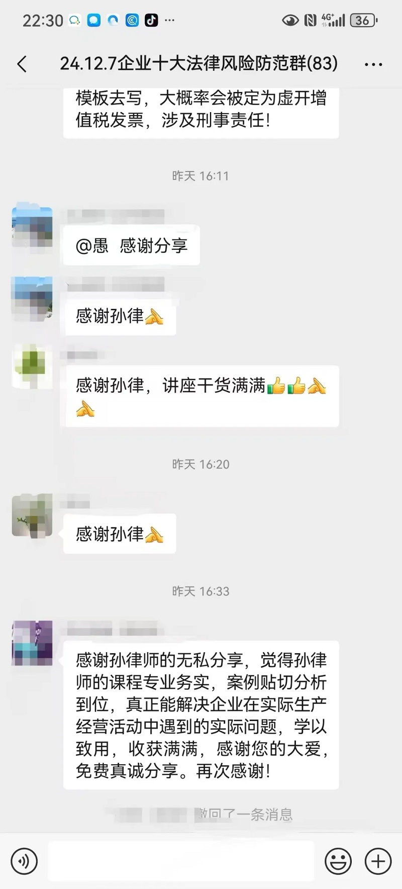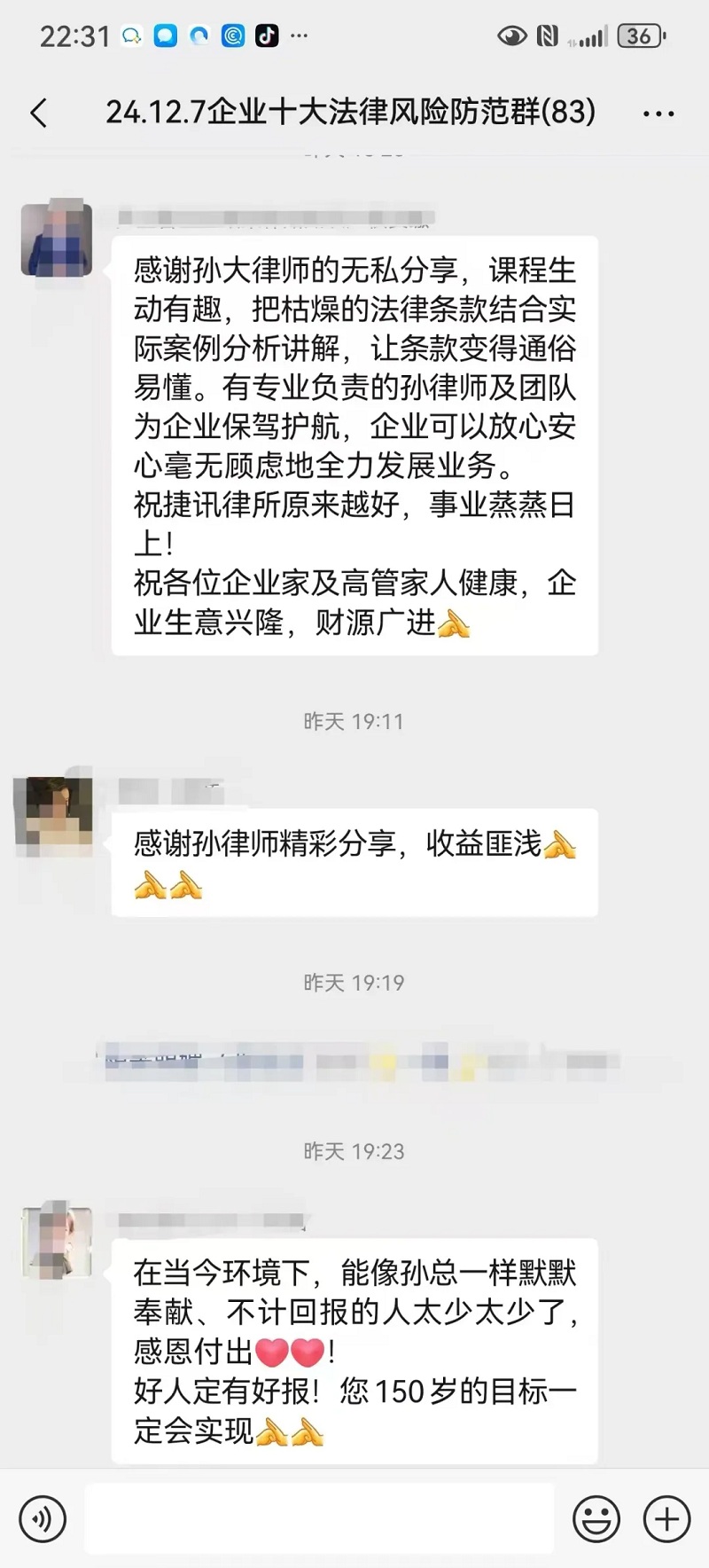 整个讲座历时一天,与会人员纷纷表示,孙律师的讲座:“讲座干货满满”、“孙律师的课程专业务实,案例贴切分析到位,真正解决企业在实际生产经营中遇到的实际问题”、“感谢孙律的精彩分享,收获匪浅”、“课程生动有趣,把枯燥的法律条款结合实际案例分析讲解让条款变得通俗易懂”、“孙律讲的涉税风险讲得非常好,难得有律师把税法能讲到位”.....讲座期间,孙律师还回答了参会人员关于企业风险防范的诸多疑问,有企业当场表示希望能聘请孙律师团队作为企业法律顾问,为企业保驾护航。